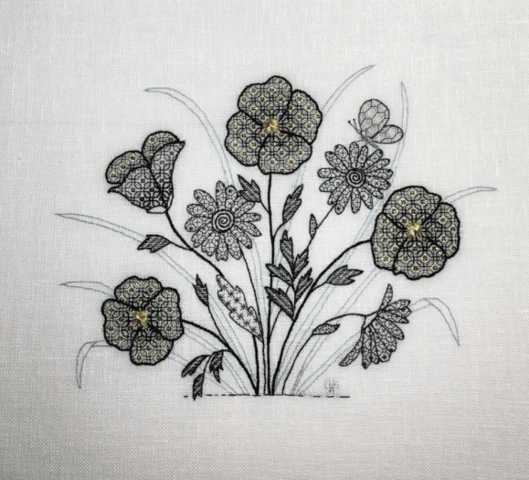 California poppy symbolizes dreams, relaxation and peace. This naturalistic group of poppies, daisies and grass is stitched in black using blackwork